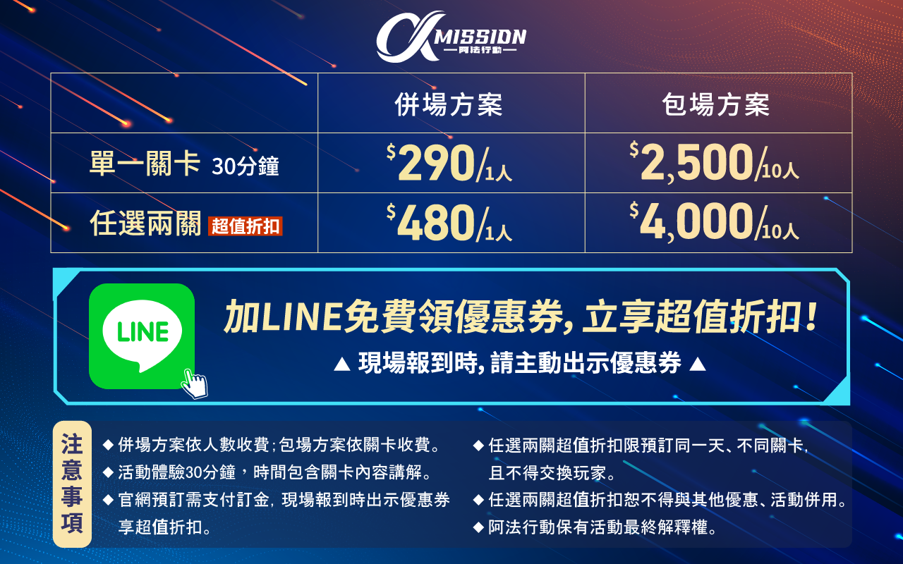 超過12人以上的團體請+官方賴 : @missionaa,讓我們幫你規劃活動行程。