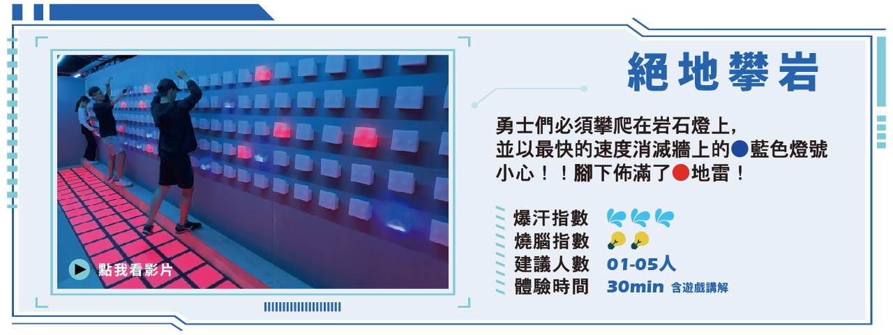 (1)絕地攀岩 : 燈牆最高為170公分,斟酌觸摸的高度進行報名。